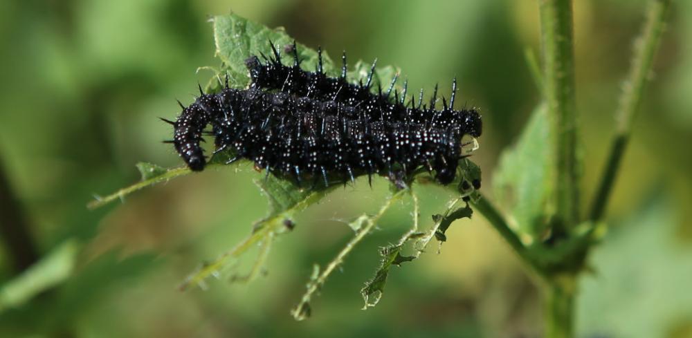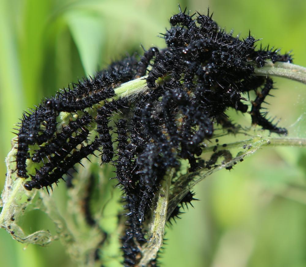 Auch die Raupen des Tagpfauenauges entwickeln sich an Brennnesseln. Warum sie sich fast immer zu großen Versammlungen zusammenschließen, ist mir ein Rätsel; denn sie machen es den Vögeln damit leicht, sich satt zu fressen. Außerdem würde auch die Nahrung länger reichen, wenn die Raupen sich über mehrere Pflanzen vereinzeln würden (s. Fotos unten). Die hier gezeigten Aggregate waren eine halbe Woche später spurlos verschwunden. Vögel hatten offenbar ganze Arbeit geleistet. Manche Raupen bleiben aber trotzdem unentdeckt; denn das Tagpfauenauge ist über die Jahre hinweg konstant einer der häufigsten Falter.