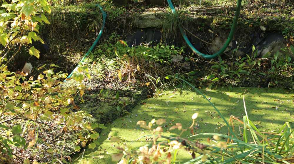 Dem Teich fehlen gut 10 cbm Wasser, über 50 % seines Fassungsvermögens.)
