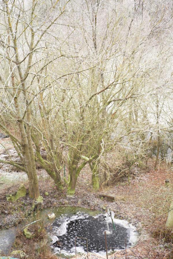 Jetzt, Anfang Dezember, sieht es schon richtig frostig aus. Was mein Teichspringbrunnen in den Frosttagen so alles angestellt hat, ist hier zu besichtigen.