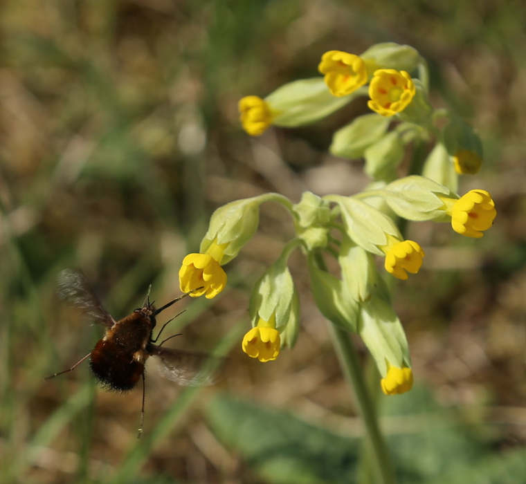Mitte April blühen aber auch schon die Schlüsselblumen, Wollschweber sind nicht wählerisch. Mit ihrem langen Rüssel kommen sie in fast jede Blüte.