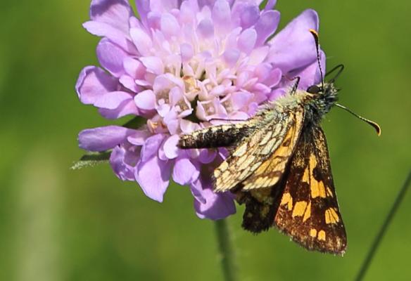 Der hübsche gelbwürfelige Dickkopffalter ist heuer öfter zu sehen als sonst. Er ist die erste Dickkopffalterart der Saison.