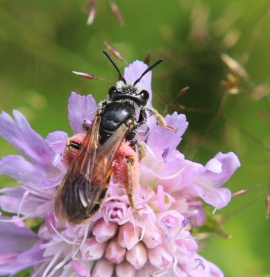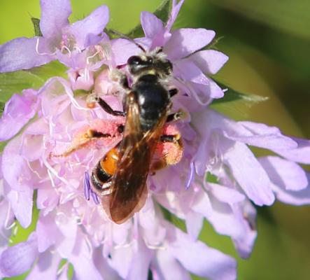 Die Knautien-Sandbiene ist meine Lieblings-Wildbiene. Sie kommt (als Weibchen) sehr bunt und auffällig daher und trägt dazu auch noch popfarbige "Gepäckstücke" mit Blütenpollen der Wiesenknautie als rosa Höschen mit sich herum. Eine davon erwischte ich zufällig im Anflug.