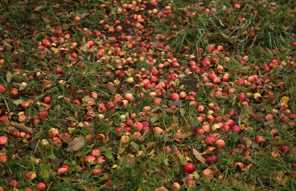 Welch eine Apfelflut dieses Jahr! Nahezu jeder Baum trägt so reichlich, dass an eine vollständige Verwertung nicht zu denken ist. Die Äpfel sind ungewöhnlich spät reif und schmecken ungewöhnlich gut, selbst die Sorten, die sonst immer sehr sauer ausfallen. Wenn man es zu Bildern wie dem mittleren kommen lässt, braucht man sich allerdings über Massenvermehrung von Mäusen nicht zu wundern. Diese brachen später sogar in meinen Keller ein und plünderten die eingelagerten Wintervorräte (das war die vielen Jahre vorher noch nie vorgekommen).