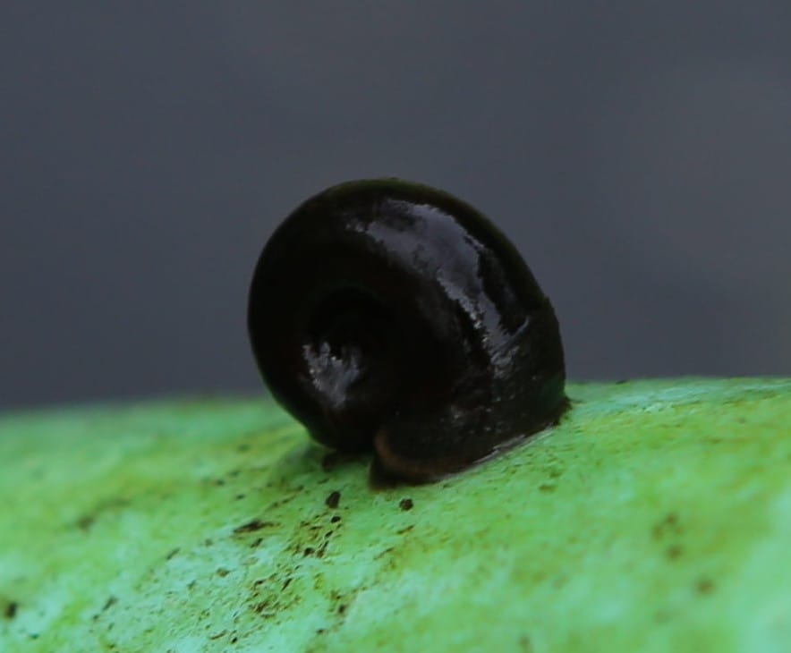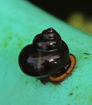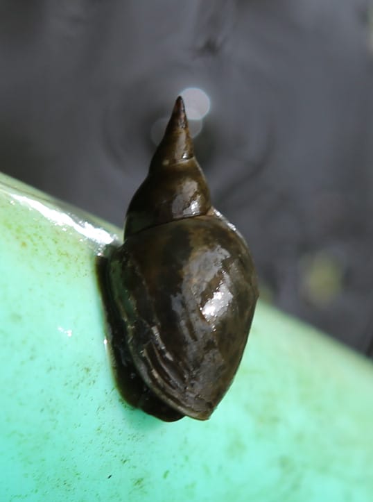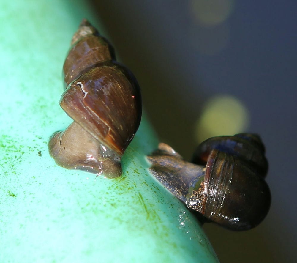Im letzten Winter, als meine Teichpumpe für lange Zeit ausfiel und das in den Teich gefallene Herbstlaub unter recht anäroben Bedingungen vor sich hinmoderte, machte ich mir große Sorgen um meine Schneckenpopulation. Besonders die lebendgebärenden Kiemenschnecken, die auf Sauerstoff unter Wasser angewiesen sind, waren scheinbar verschwunden. Aber - o Wunder - einige kleine "Schneckchen" hatten offenbar überlebt und bauen nun fröhlich am Fortbestand der Population von Sumpfdeckelschnecken Viviparus viviparus und Viviparus contectus [Unterscheidungsmerkmal: Letztere fühlt sich oben spitz an]. Um die Spitzschlammschnecke (Lymnea stagnalis), eine Lungenschnecke, die auch mit sauerstoffarmem "Dreckwasser" zurecht kommt, muss man sich nicht so viel Sorgen machen. Auch die Posthornschnecke (Planorbarius corneus) ist eine Lungenschnecke. Trotzdem war sie nach dem letzten Winter nahezu verschwunden und der Bestand hat sich noch nicht ganz erholt. Alle miteinander grasen mitunter in trauter Gemeinsamkeit den Algenrasen eines Gartenschlauch ab, gegen dessen hellgrüne Farbe sie sich gut abheben.