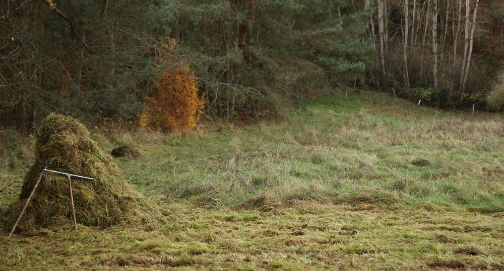 Im November ist das Gröbste geschafft. Die Wiese ist gemäht. Einen Teil des Bewuchses lasse ich stehen; denn manche Insekten haben ihre Kinderstube in Pflanzenstengeln. Enorm, was in diesem regenreichen Jahr an Heu anfiel.