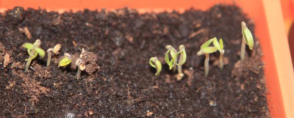 Warten die schon aufgegangene Jungpflänzchen auf der Heizung zu lange auf andere, wird ihnen die Wärme zu viel und sie werden sie „gakelig“; denn auf nichts hoffen sie nun mehr als auf Licht (möglichst Sonnenlicht).