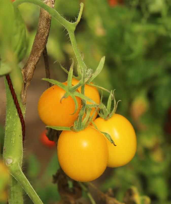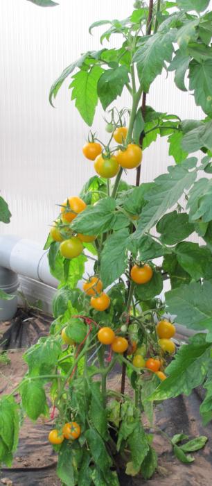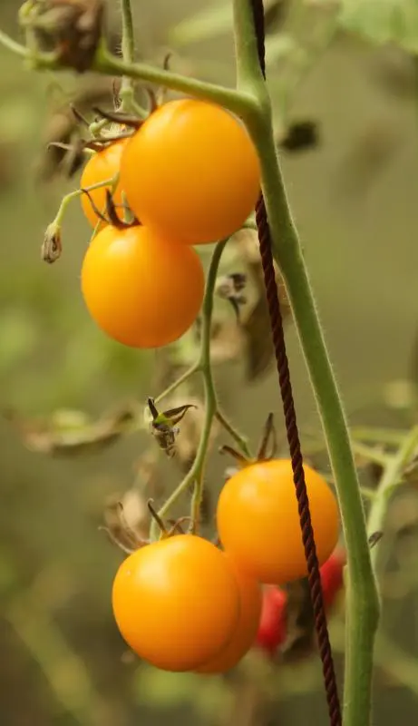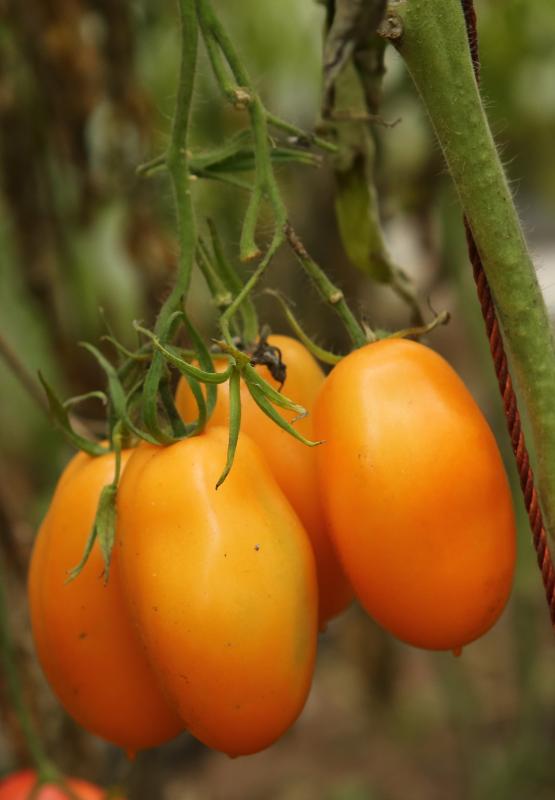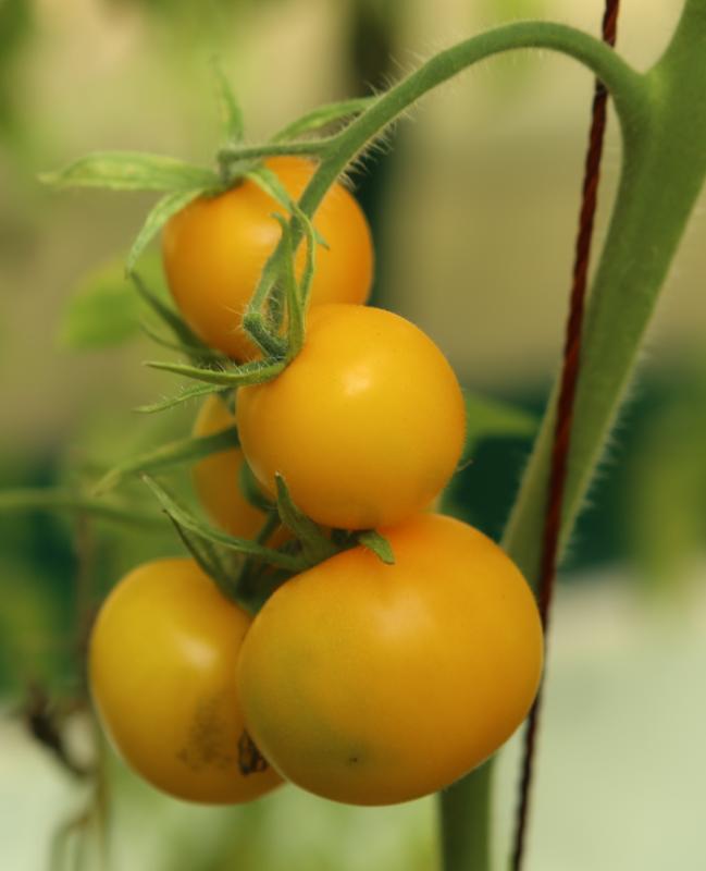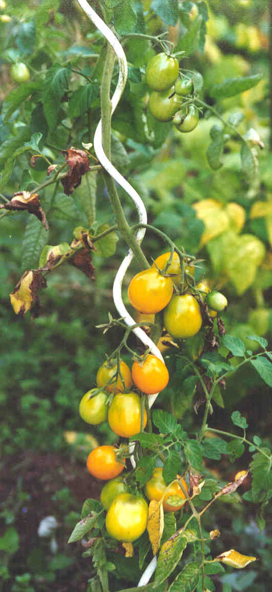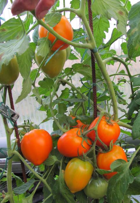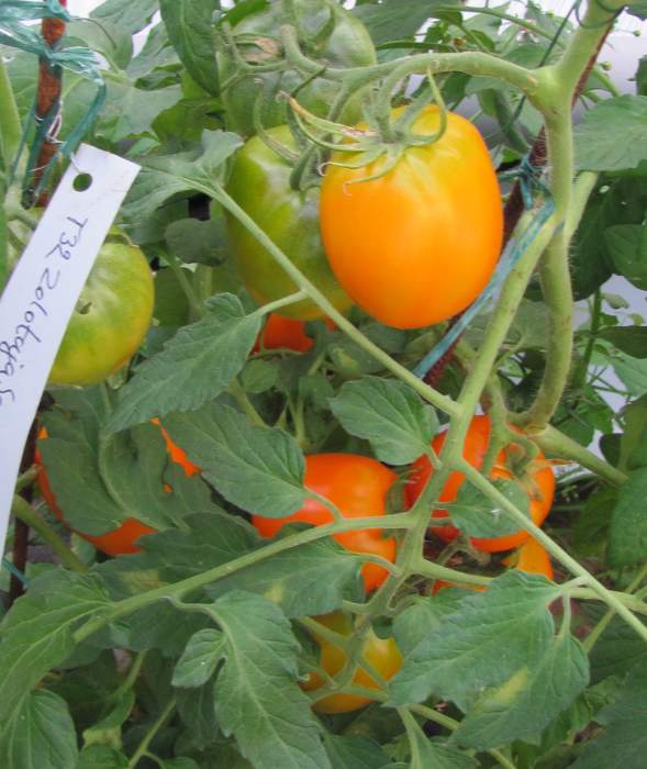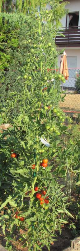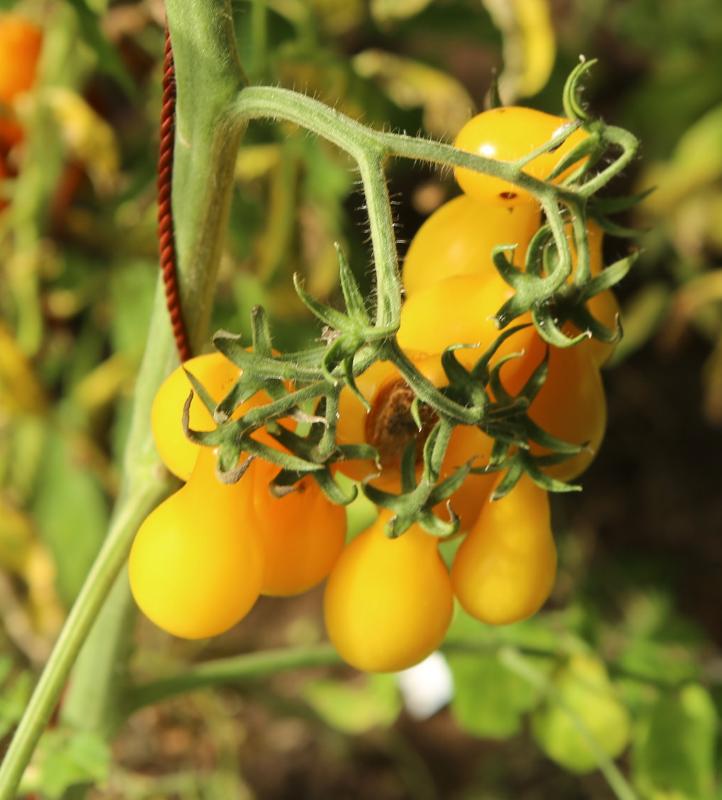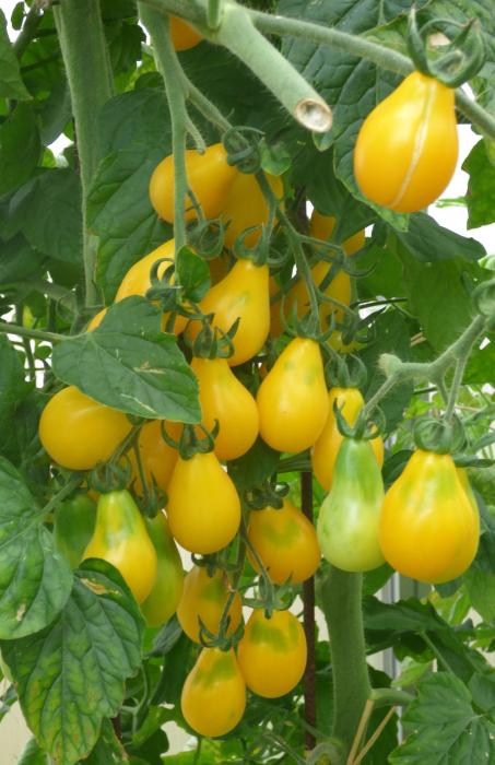 Sehr hohe Stabtomate, gelb-ovale Früchte 60-80g.