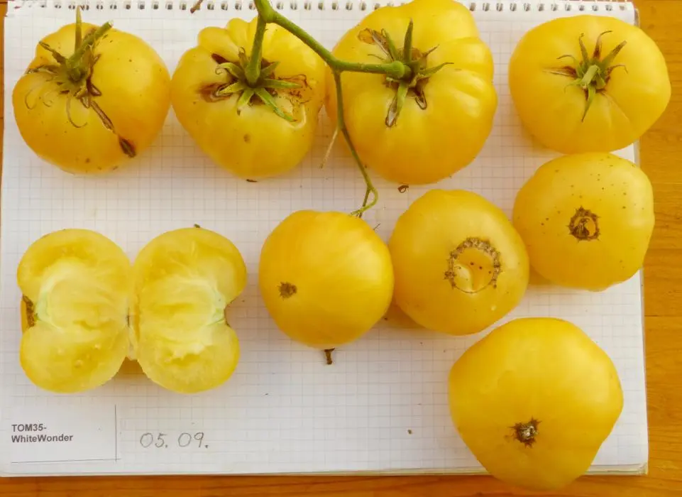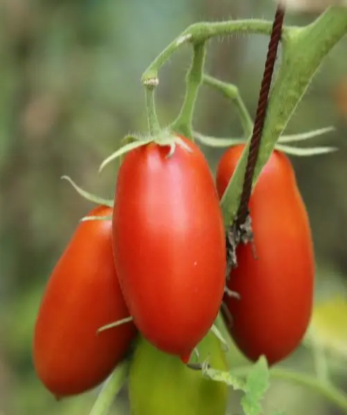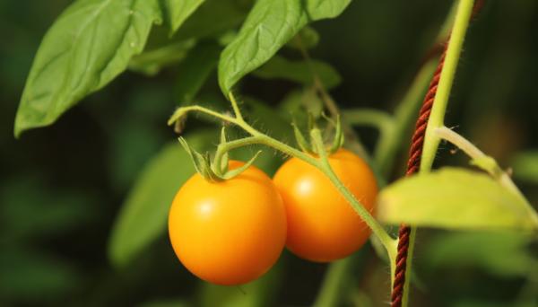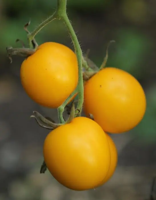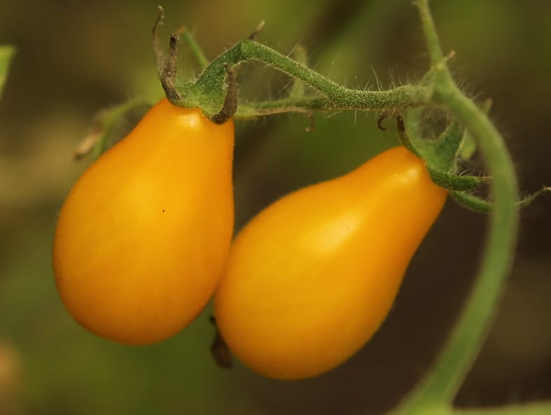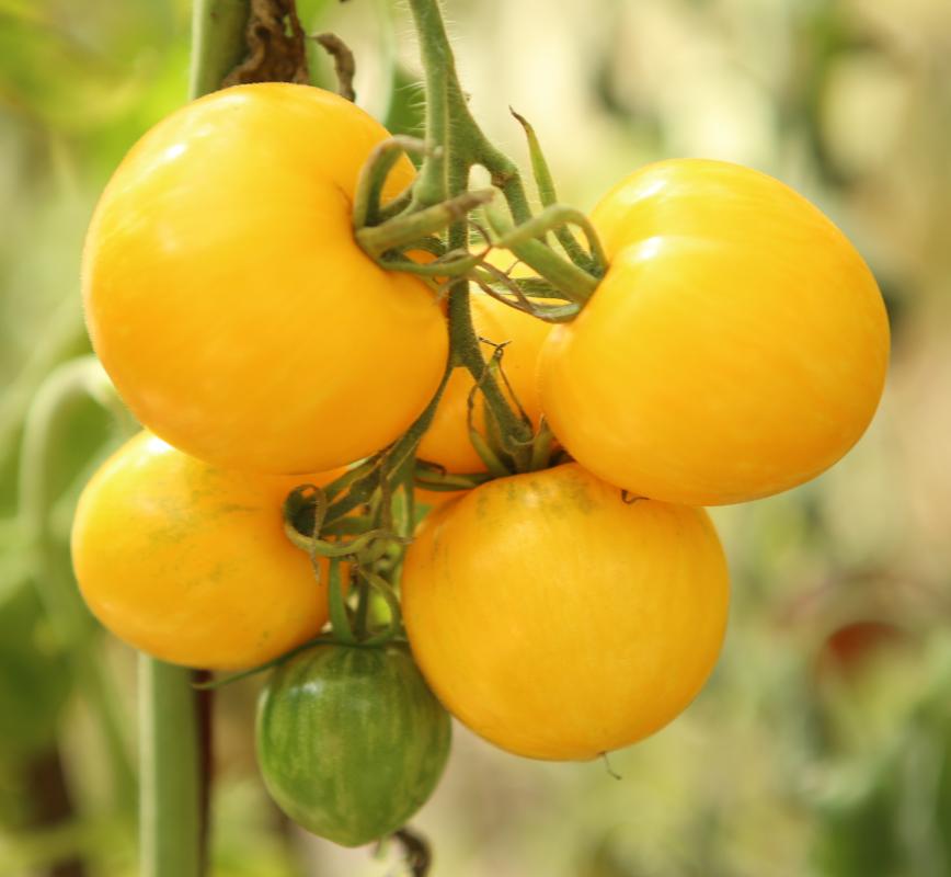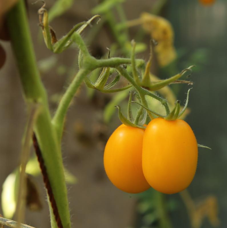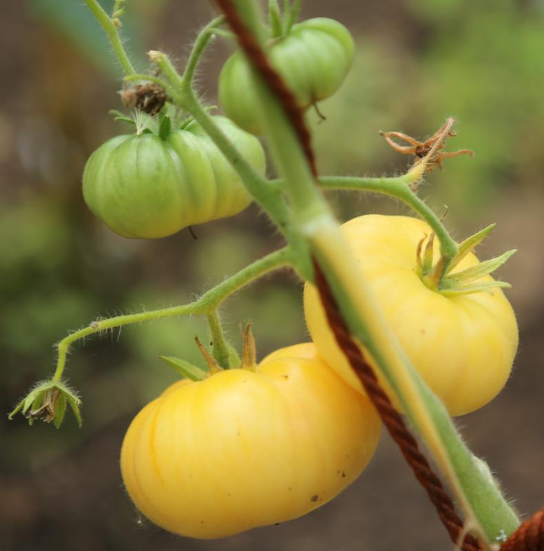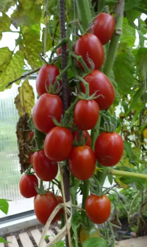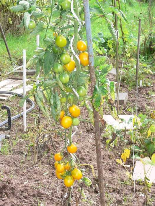 Sehr hohe Stabtomate, gelb-ovale Früchte 60-80g.