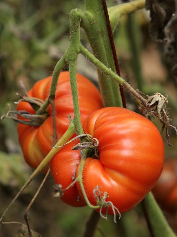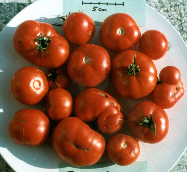 Riesen-Fleischtomate, manchmal beutelartig, am Stielansatz oft geplatzt