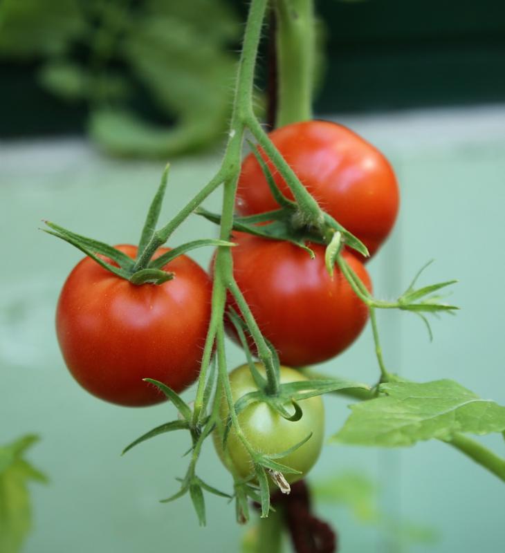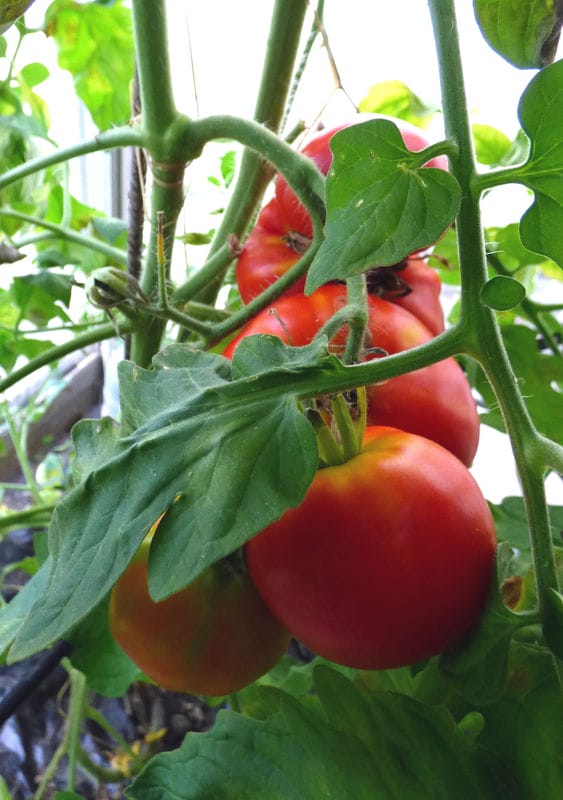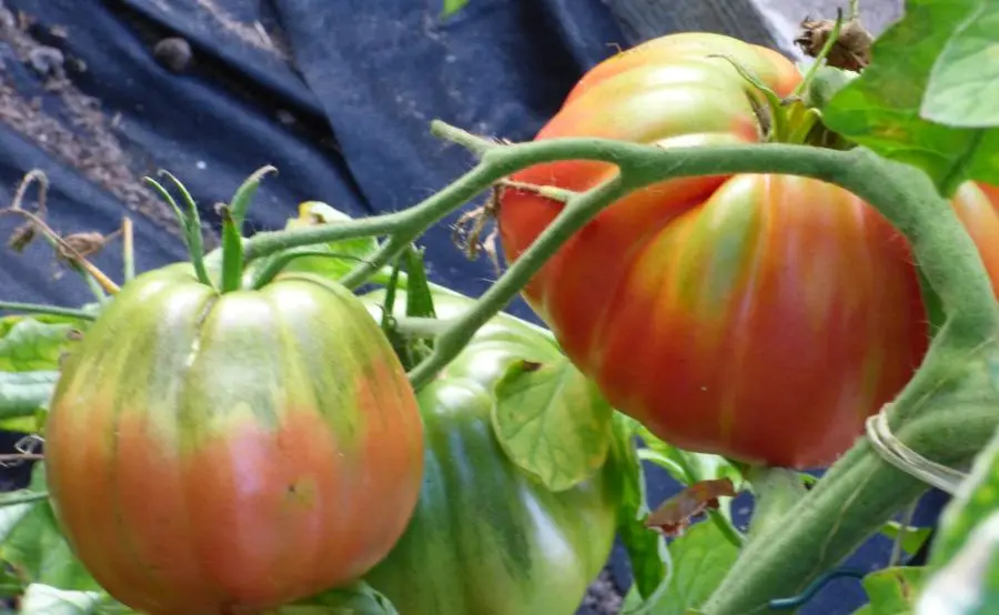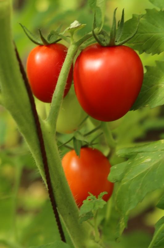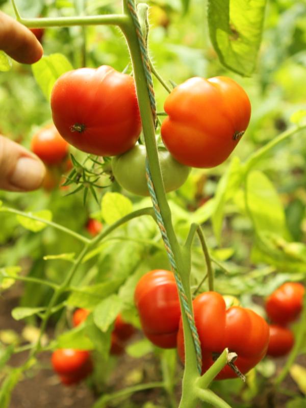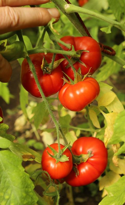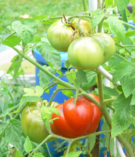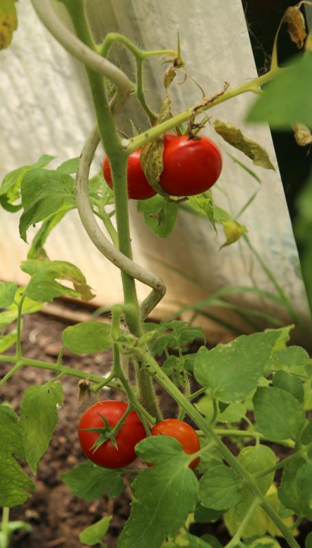 Erntebeginn. Stabtomate. Himbeerfarbige eher kleinkalibrige