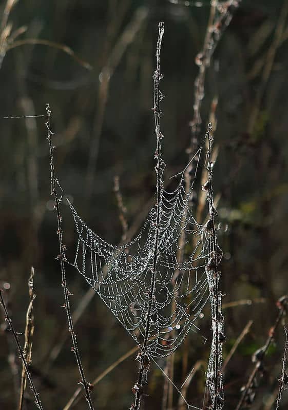 Dort wo auf meiner Wiese gerade keine Gehölze aufkommen, lasse ich sie gerne ungemäht. Das ist eine Voraussetzung, um im Spätherbst Spinnweben zu beobachten. Die zweite wichtige Voraussetzung ist eine spezielle sehr kurzzeitige Wettersituation: Morgensonne nach kalten Nächten (mittags ist der Morgentau schon wieder weg). Unglaublich, wieviele Spinnen mit ihren Fangnetzen auf einer wilden Wiese auf Beute lauern. Manche scheinen dabei künstlerisch anspruchsvoll vorzugehen, andere Netze wirken etwas "schluderich" aufgespannt. Man müsste einmal die Netzkonstruktionen im Hinblick auf die Effizienz im Verhältnis von Sorgfalt und Materialeinsatz zu Beutefang untersuchen. Aber dieser "Forschungsansatz" wäre vermutlich zu kurz gegriffen; denn es geht ja sogar ganz ohne Netz (sprich: Materialeinsatz), wie viele erfolgreiche Spinnenarten beweisen.