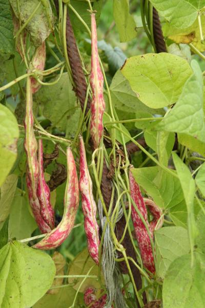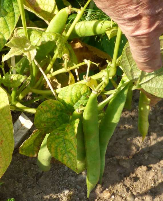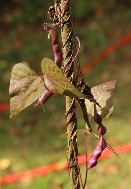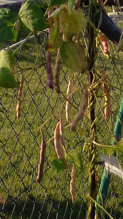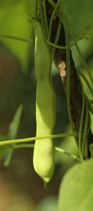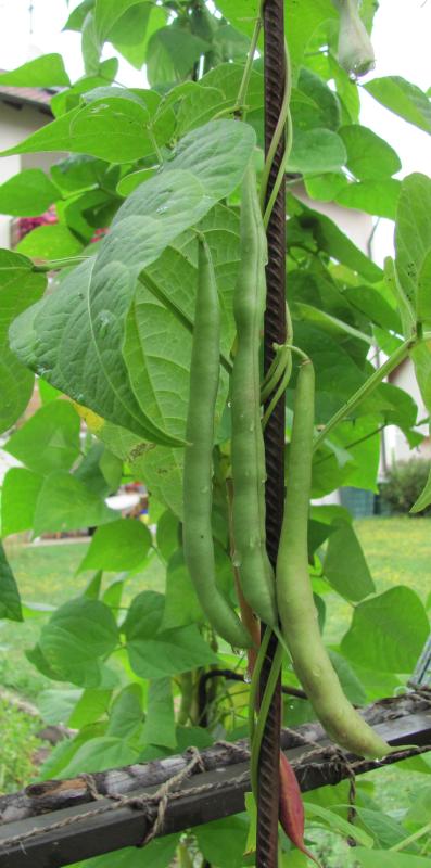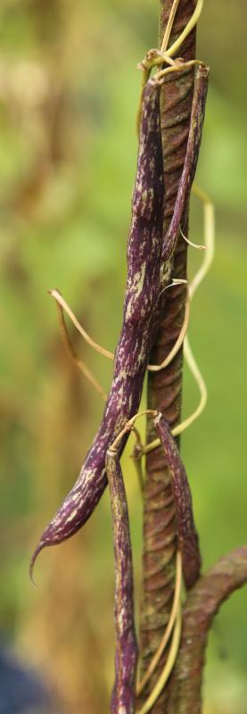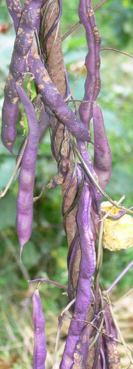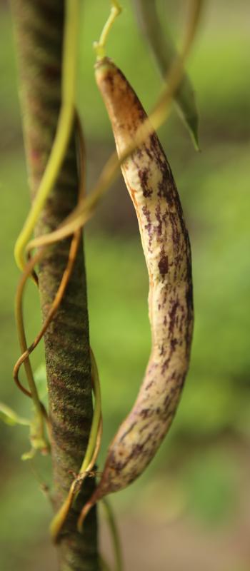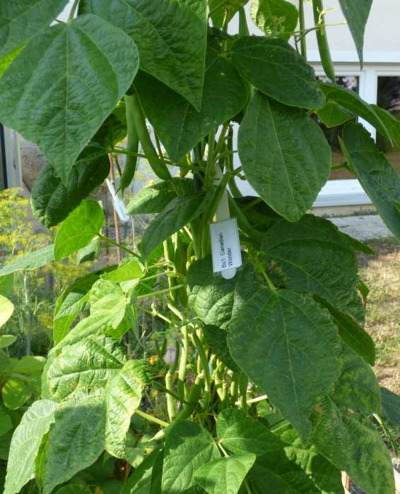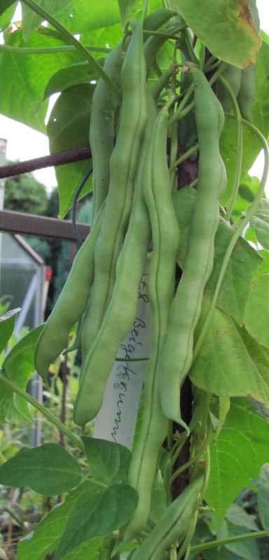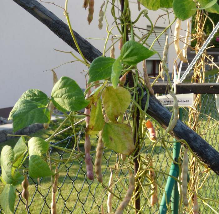 Pfl. nur 1m hoch. Ende August ganze 3 Hülsen (ca. 18cm lang, geradwüchsig) geerntet (9 Kerne). [MHä<24>]