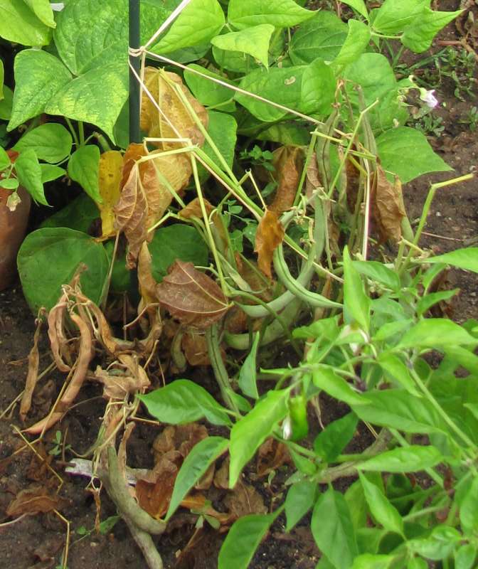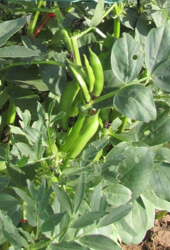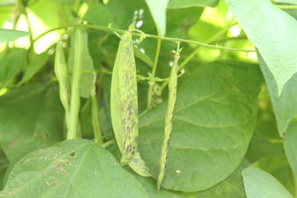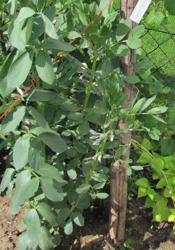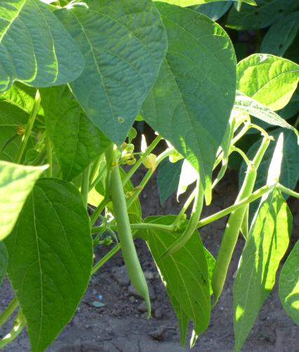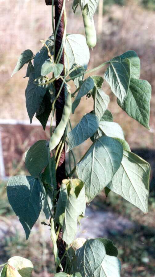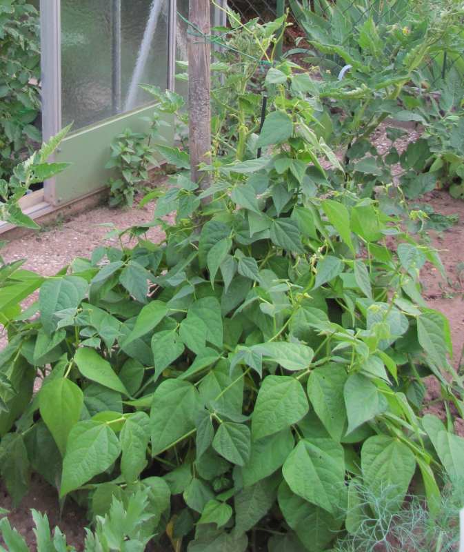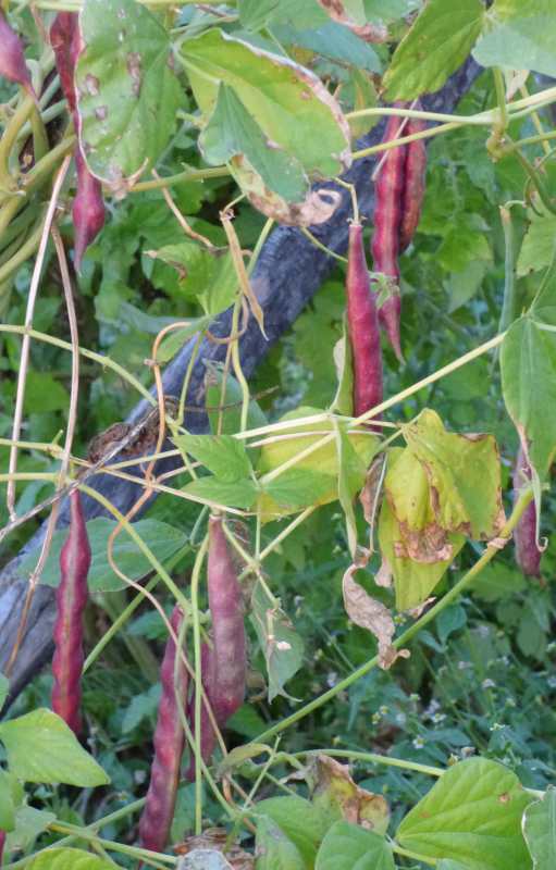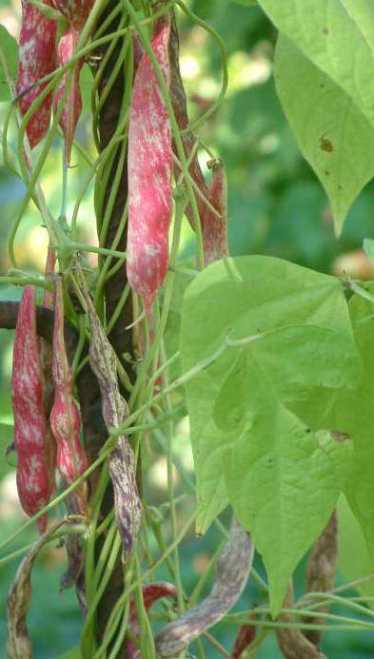 Pfl. nur 1m hoch. Ende August ganze 3 Hülsen (ca. 18cm lang, geradwüchsig) geerntet (9 Kerne). [MHä<24>]
