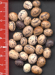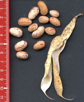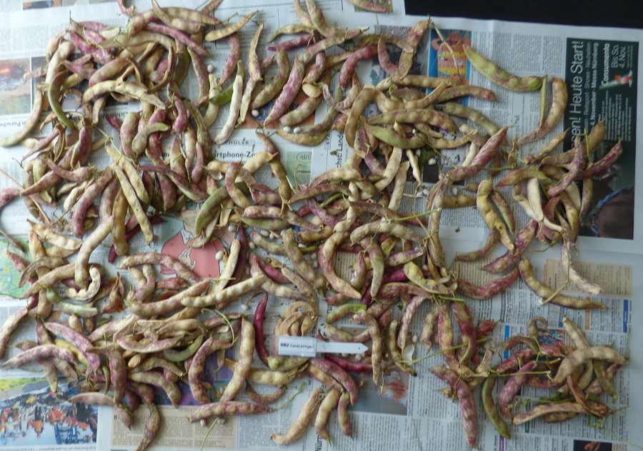 [RH<07>] <16>:Ernte kommt ab 19.8. (2 erste Hülsen) sehr langsam in Trab und ist insgesamt eher mittelspät. Die Kerne sind sehr bunt, der ursprünglich "Belag" ist nur auf wenigen erkennbar (rechts im Bild