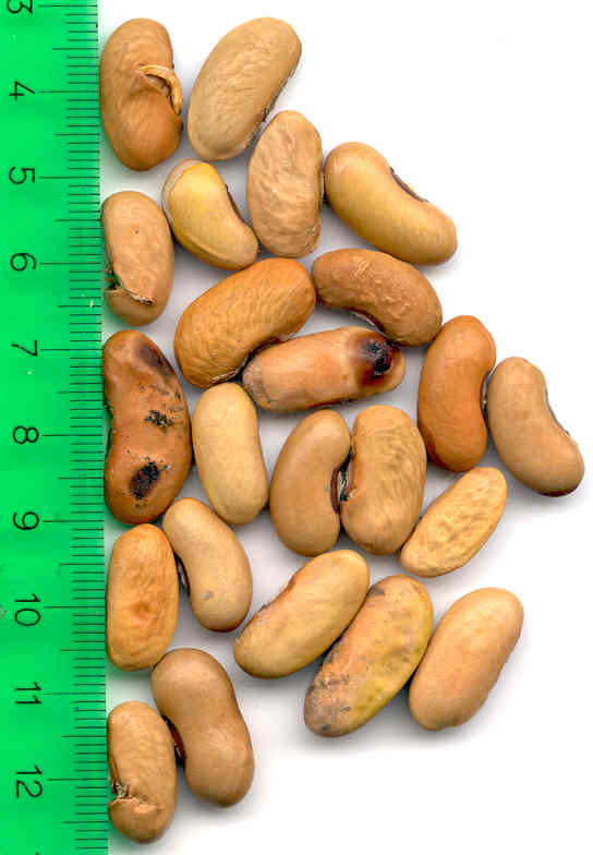Etliche beige Kerne aufgetreten. Guter Nettoertrag trotz starkem Käferbefall. <16>:Bescheidene Ernte ab 9.8. "Riesig" ist nur eine einzige Hülse (5 große Kerne), weder die Pfl., noch die Hülsen und Kerne wirken ansonsten riesig. [RB<19>]Ertrag 400g; Kerne überwiegend groß. [RB<22>]:Ertrag 310g.