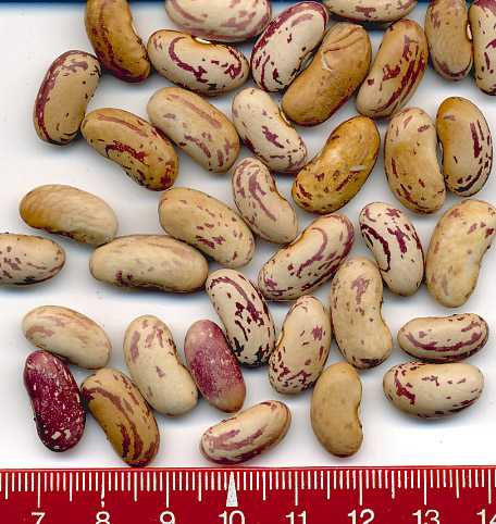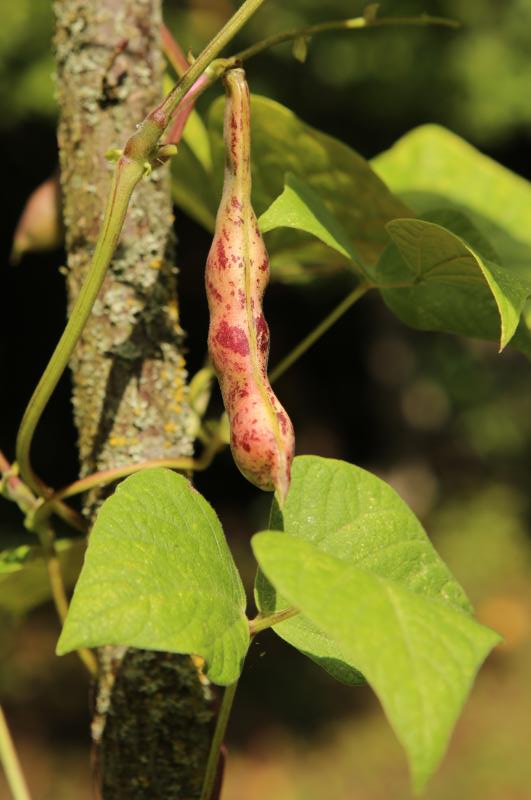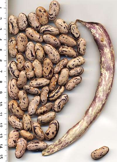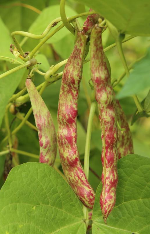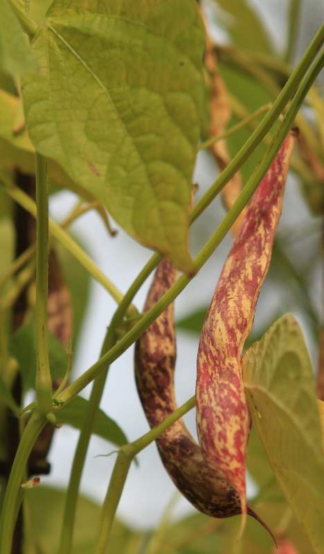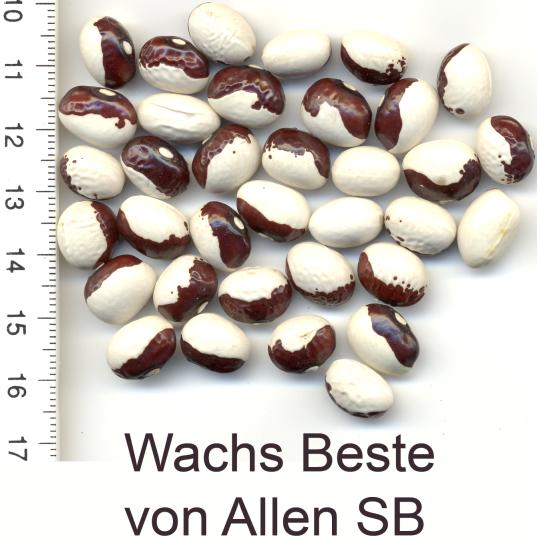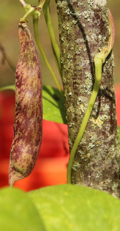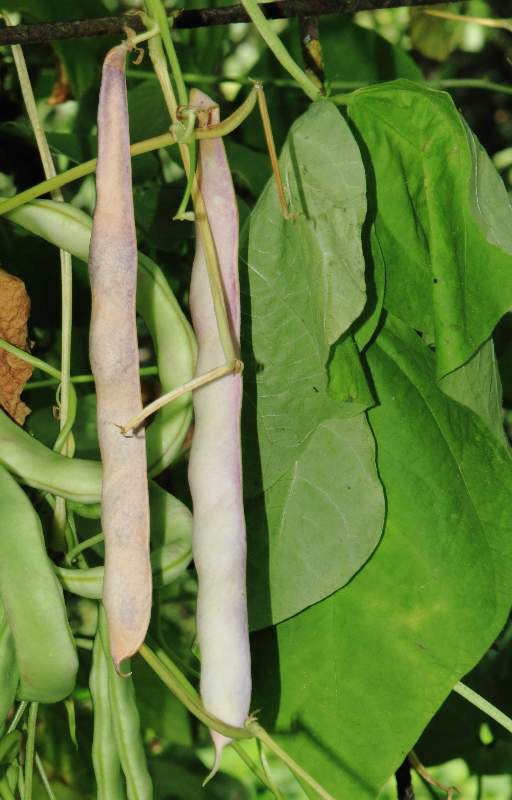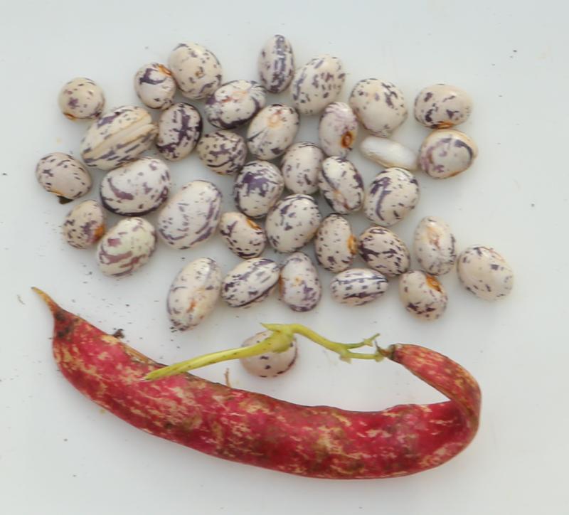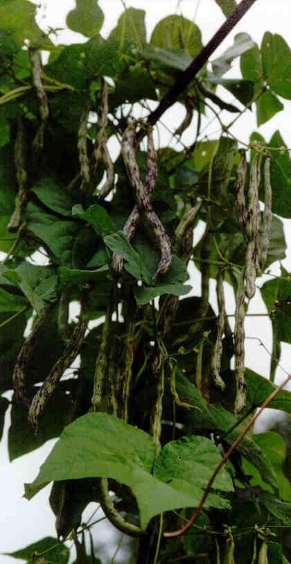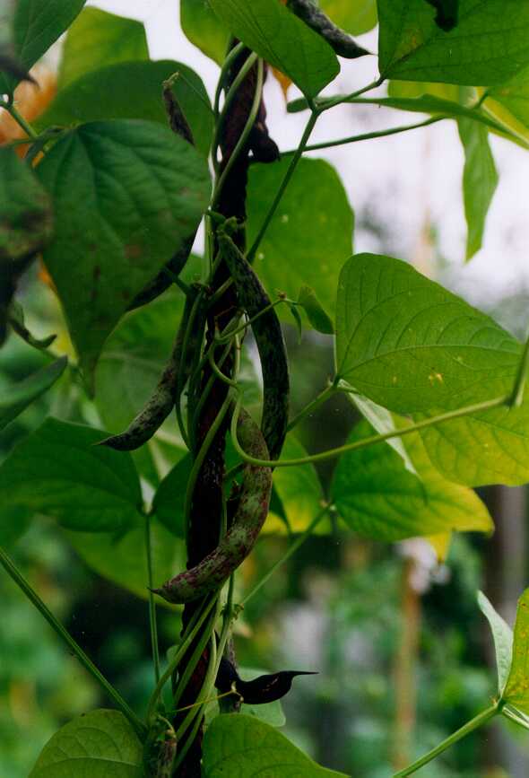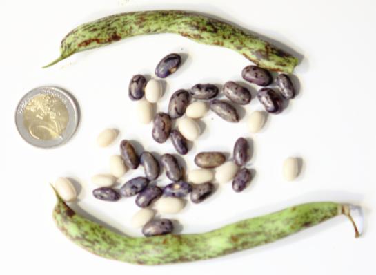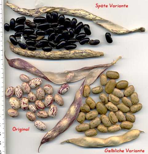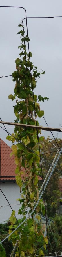 abgeerntet. Ob diese Sorte unter meinen Klimabedingungen Zweck hat? [MHä<16>] [RB<19>]Hoher Ertrag: Knapp unter 500g. Offenbar nicht mehr sortenrein: Viele Bohnen sind nicht einfarbig, sondern dunkel gemustert. <23>:Pfl. sehr hoch >4m. Sehr später, aber rekordverdächtiger Ertrag. Hülsen ca. 8cm lang, beulig, grün mit zartlila Musterung. Ertragreiche, aber sehr (zu?) späte Sorte.