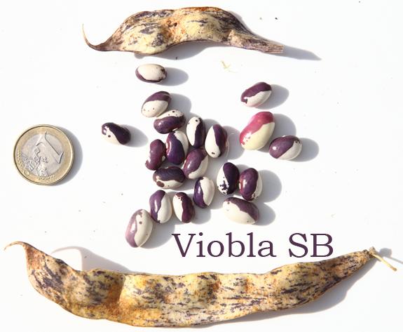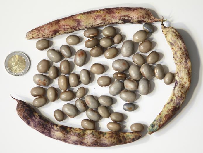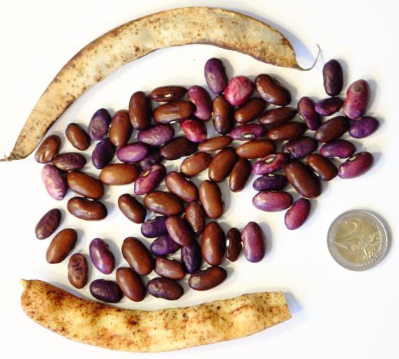 Hülsen lila-beige gemustert, breit-fleischig. Kerne tendieren zur