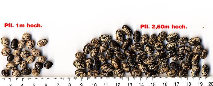 . Geringe Ernte; Variante lohnt vielleicht doch nicht, zumal die Streifen des Vorjahrs meist nicht auftreten. <22>:Pfl. >4m. Sehr spät, aber lohnend. Ernte 37g, einfarbige Kerne wie gehabt, nur selten mit Streifen. Weiter beobachten! [RB<23>]101g Ertrag. Kerne überwiegend einfarbig braun