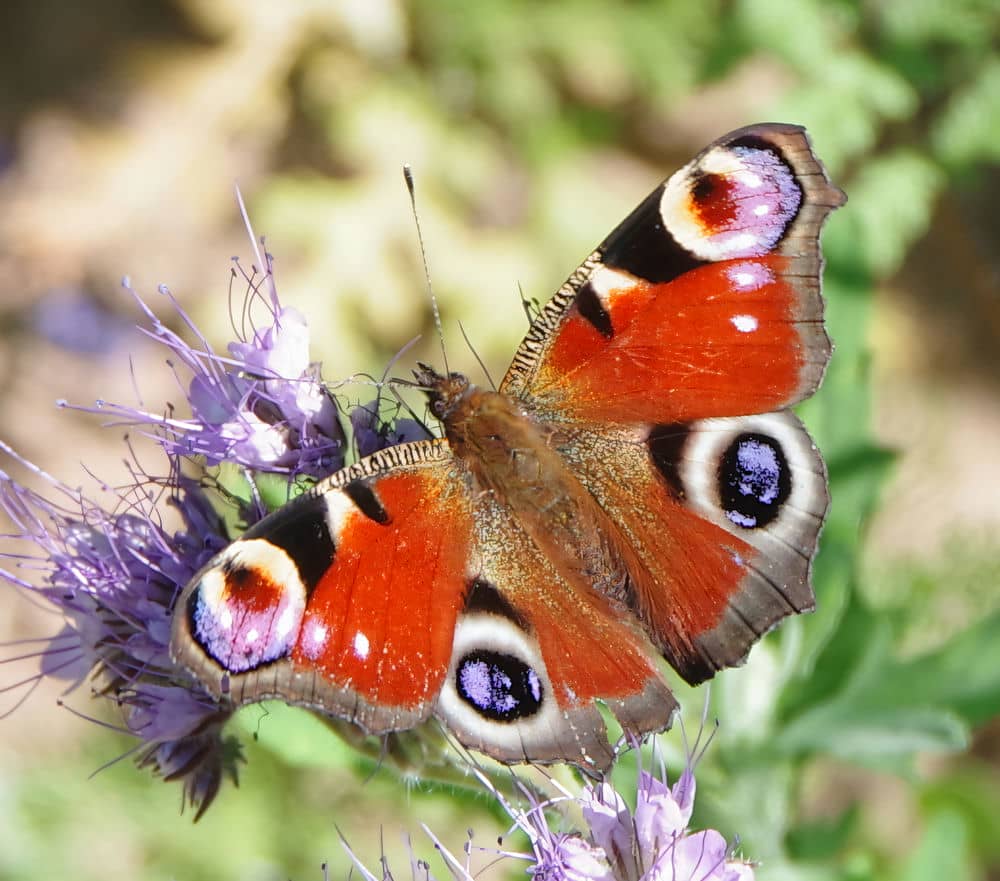 Jedes Kind kennt diesen hübschen Falter. Die „Pfauenaugen“ auf den Flügeln, die wir so hübsch finden, sollen Vögel abschrecken.