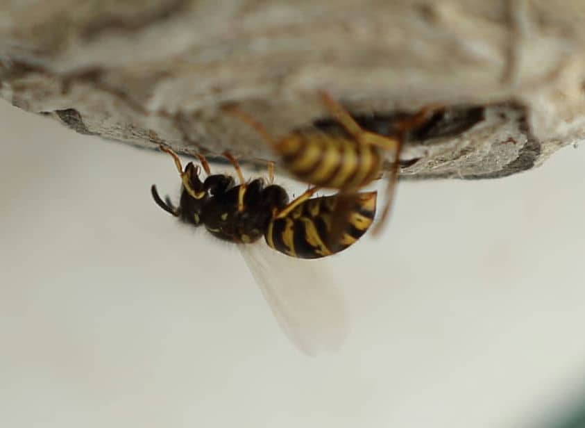 Ein besondere Erlebnis wurde mir zuteil, als ich nach längerer Pause an meinem Balkontisch Platz nehmen wollte und mir binnen Sekunden vier Wespenstiche einfing. Erst nach ausgiebiger Suche entdeckte ich dieses hablkugelige Nest unter der Tischplatte. Die Sächsische Wespe baut keine allzu großen Nester und gilt eigentlich als relativ friedlich. Aber - selbstverständlich! - rütteln am Balkontisch (beim Hinsetzen fast unvermeidlich) provoziert sie zur Verteidigung ihrer Behausung. Als ich später langsam um den Tisch herumschlich, ohne ihn zu berühren, konnte ich mich dem Nest auf einen Meter nähern, ohne einen Angriff auszulösen.