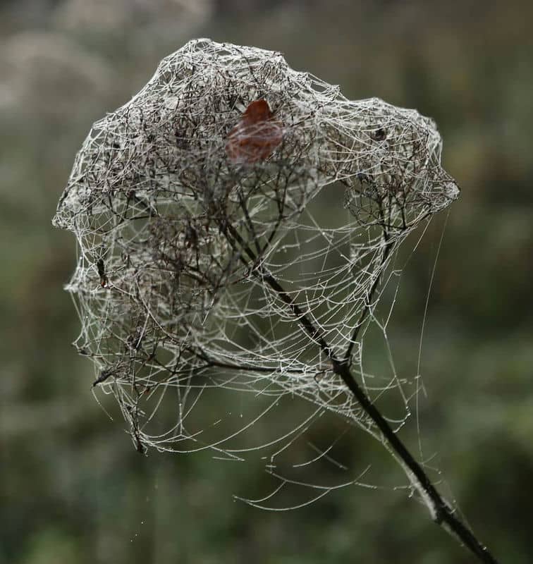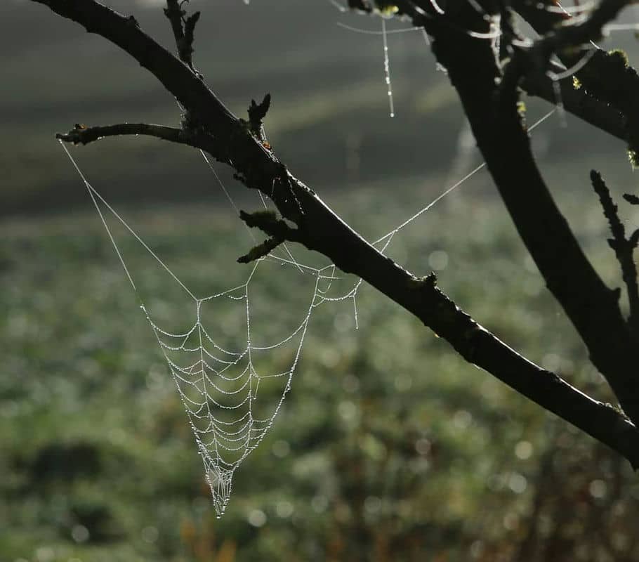 Dort wo auf meiner Wiese gerade keine Gehölze aufkommen, lasse ich sie gerne ungemäht. Das ist eine Voraussetzung, um im Spätherbst Spinnweben zu beobachten. Die zweite wichtige Voraussetzung ist eine spezielle sehr kurzzeitige Wettersituation: Morgensonne nach kalten Nächten (mittags ist der Morgentau schon wieder weg). Unglaublich, wieviele Spinnen mit ihren Fangnetzen auf einer wilden Wiese auf Beute lauern. Manche scheinen dabei künstlerisch anspruchsvoll vorzugehen, andere Netze wirken etwas "schluderich" aufgespannt. Man müsste einmal die Netzkonstruktionen im Hinblick auf die Effizienz im Verhältnis von Sorgfalt und Materialeinsatz zu Beutefang untersuchen. Aber dieser "Forschungsansatz" wäre vermutlich zu kurz gegriffen; denn es geht ja sogar ganz ohne Netz (sprich: Materialeinsatz), wie viele erfolgreiche Spinnenarten beweisen.