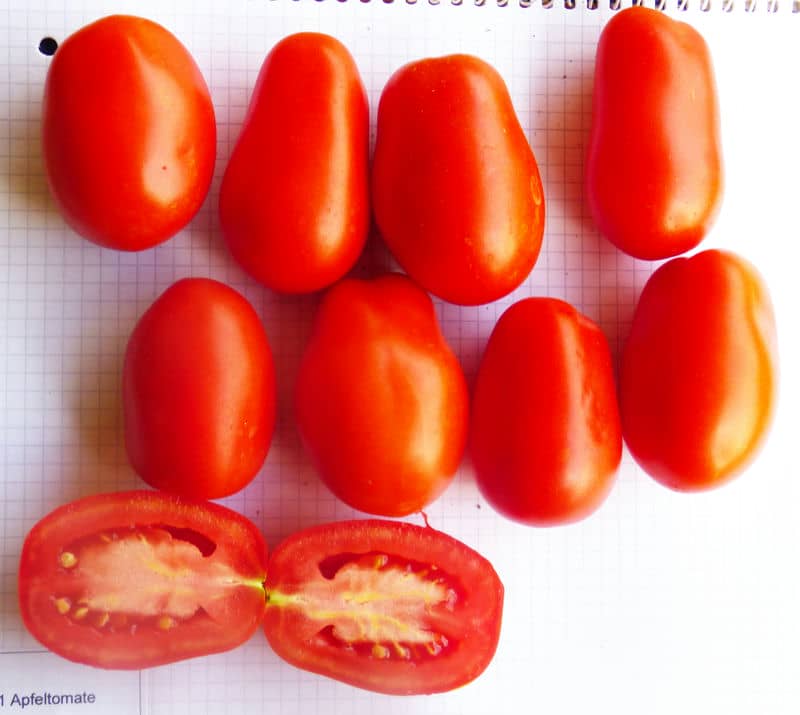 , fest, saftig, aromatisch. Wenig Stielansatz. Vielseitig verwendbare Ketchup-Sorte.