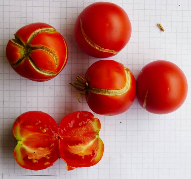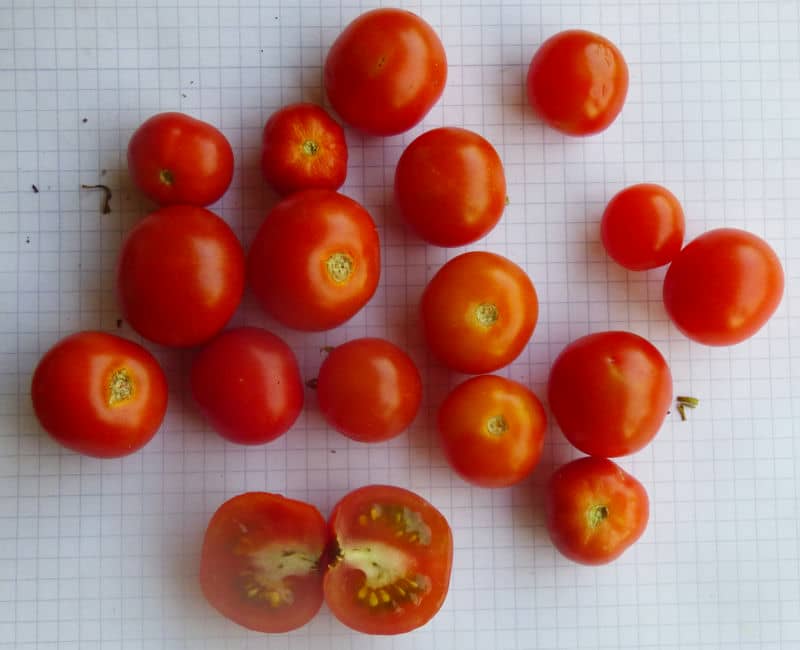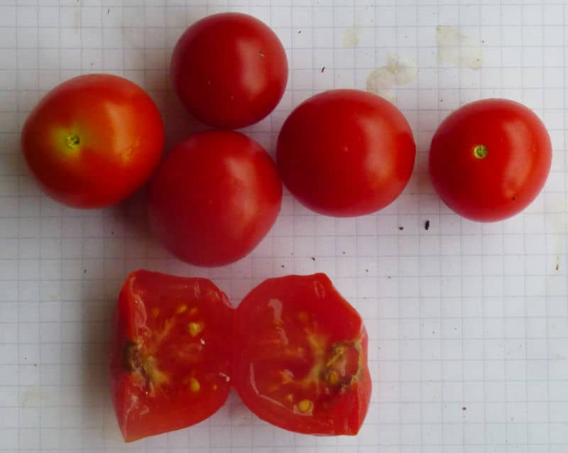 (alle zweikemmerig mit Tendenz zur Hohlkammerigkeit!) von ca. 2m hohen Pflanzen. Geschmack nicht schlecht. Gute Sorte! {RB19}Pfl. bis 3m. Früchte nicht platzfest, 3-5cm