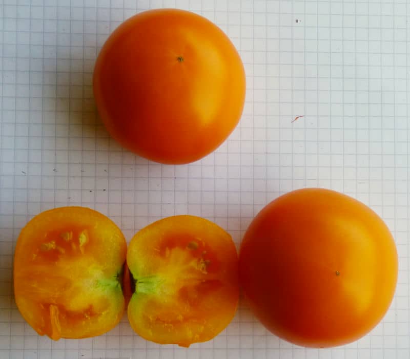 "Mini-Ochsenherz". Außenhaut kräftig orange-gelb. Viele Samen.